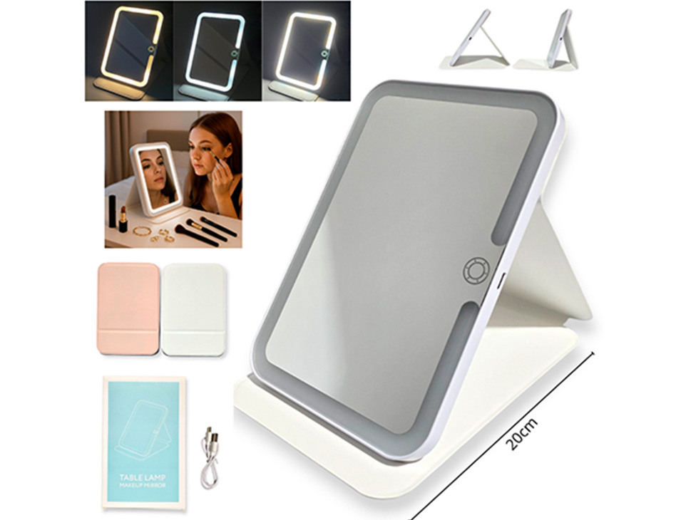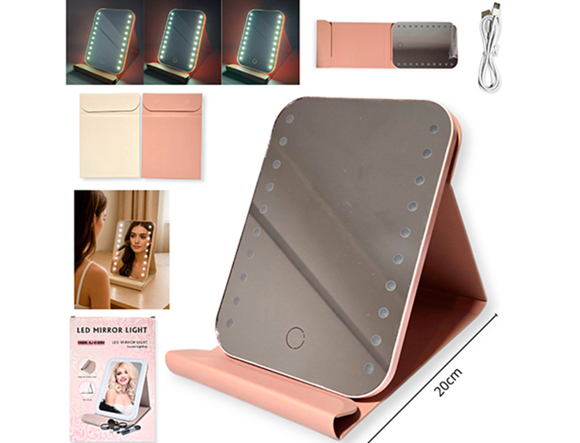 08-CEPILLOS Y ESPEJOS ESPEJO PLASTICO CON LUZ 3 INTENSIDADES 2 COLORES 20X13CM |