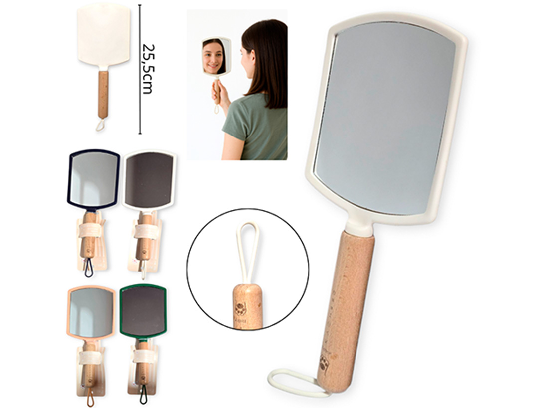 08-CEPILLOS Y ESPEJOS C ESPEJO DE MANO MANGO MADERA 3 COLORES 26CM |
