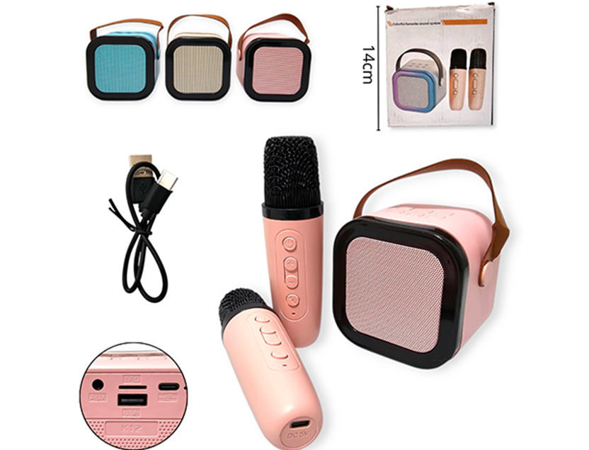 14-ELECTRONICA ALTAVOZ PARLANTE CON 2 MICROFONOS CARGA USB LUZ LED |
