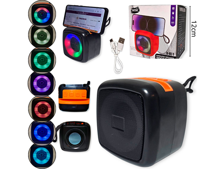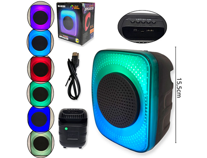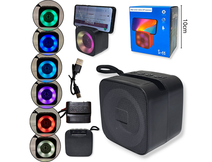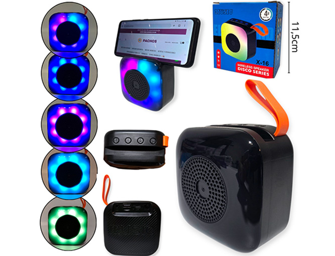 14-ELECTRONICA ALTAVOZ MINI CUAD. CARGA USB CON LUCES VARIOS COLORES |