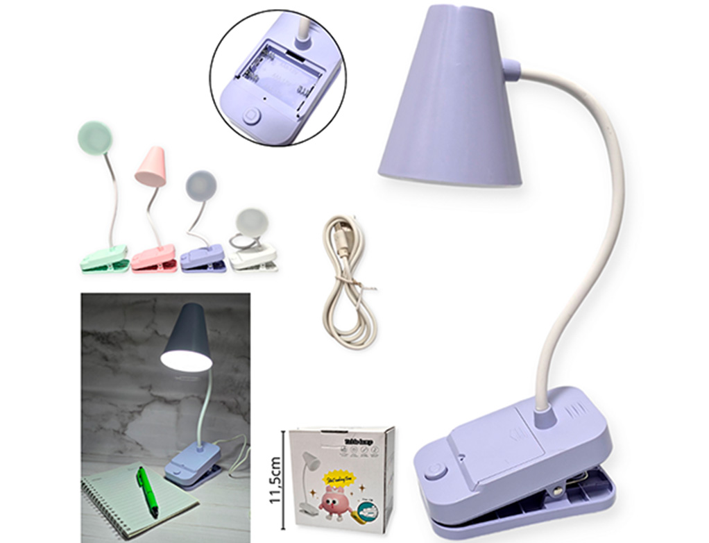 14-ELECTRONICA VELADOR LAMPARA DE ESCRITORIO PLASTICO A PILA C/ PINZA VARIOS COLORES |